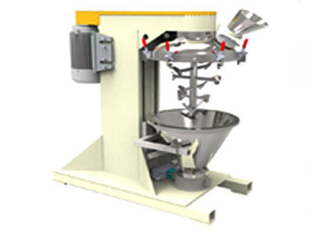 產品通過錐形混合腔頂部投入,投料范圍在30%-100%之間,設備中間有一個頂部驅動的高速轉軸,因此便去除了在產品區(qū)域的密封設計以及軸承。在軸上有緊貼內壁的槳式混合原件。通過高速旋轉的攪拌槳和錐形內倉的共同作用將產品由底部帶至混合腔的上部。當產品達到頂部的時候又重新回落到混合倉中心,如此的產品的方式形成了一種快速的宏觀混合。